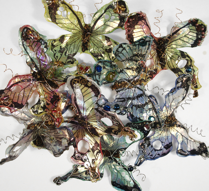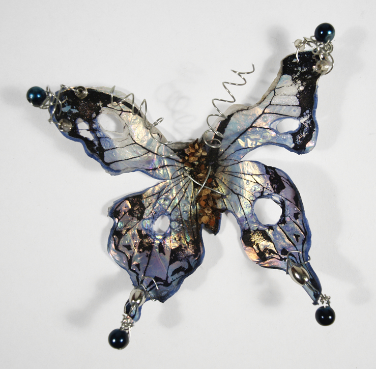 I worked on these butterflies right after I finished my pages. Had to, got started and couldn’t stop! What actually happened is I took them to work to show off and my friend Nancy said (having seen the pages already), “Oh, these are nice too, but no wires.” So naturally I had to put wires on them, then beads and findings found their way into the project too!